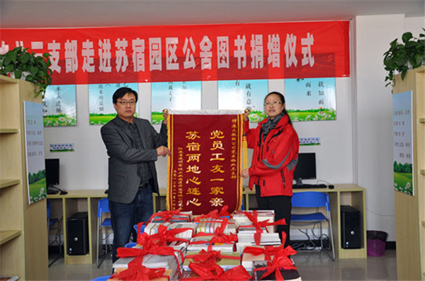 活動現(xiàn)場,陳彤彤代表蘇大教服集團(tuán)黨委物業(yè)三支部捐贈了《紅樓夢》、《中國文學(xué)》、《管理學(xué)》等書籍20余種310冊和羽毛球拍、乒乓球拍等文體用品;張驥代表建發(fā)公司向蘇大教服集團(tuán)黨委物業(yè)三支部贈送了題為“黨員工友一家親,蘇宿兩地心連心”的錦旗,以示感謝。