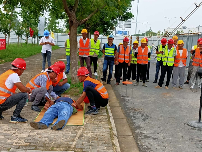 此次演練是模擬工人在戶外作業(yè)時發(fā)生中暑后的現(xiàn)象以及如何進(jìn)行急救的。演練現(xiàn)場,演練示范人員按照應(yīng)急預(yù)案對“中暑”的員工進(jìn)行緊急施救,首先發(fā)現(xiàn)中暑人員后將其迅速轉(zhuǎn)移到陰涼通風(fēng)的地方,移動、冷敷、擦浴、降溫、補(bǔ)水......各項救援措施緊張有序。整個演練過程歷時30多分鐘,中暑人員在急救小組的緊密合作下,及時得到救治。演練過程中,市政工程部全體人員和各在建工地相關(guān)人員全程參與觀摩。