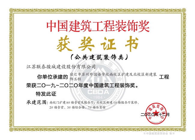 近期,傳來喜訊,由開發(fā)公司代建的宿遷市蘇州外國語學(xué)校南校區(qū)擴(kuò)建及北校區(qū)新建裝飾工程獲得中國建筑裝飾行業(yè)最高獎項(xiàng)“中國建筑工程裝飾獎”。
