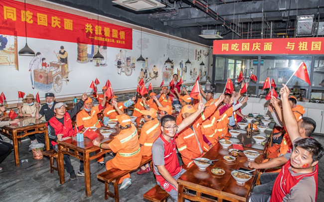 為喜迎中華人民共和國(guó)成立73周年,9月30日上午,蘇宿工業(yè)園區(qū)城發(fā)公司、建發(fā)公司在陽(yáng)澄鄰里中心“陸長(zhǎng)興”面館開展“同吃國(guó)慶面 共敘愛國(guó)情”主題活動(dòng),邀請(qǐng)園區(qū)環(huán)衛(wèi)工人、保安、保潔和快遞小哥代表,以同吃一碗“國(guó)慶面”的“新民俗”方式歡度國(guó)慶,在歡歌笑語(yǔ)中,敘說(shuō)家國(guó)情懷。