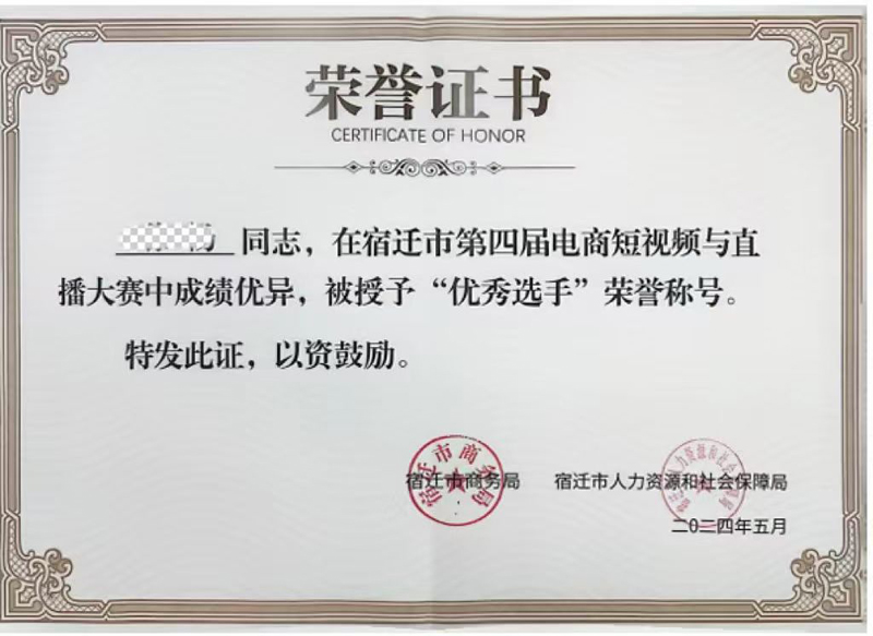 榮譽證書得獲得不僅是對參賽選手個人努力和才華的認(rèn)可,也是對蘇宿電商園在電商領(lǐng)域?qū)I(yè)人才培養(yǎng)和推動電商直播行業(yè)發(fā)展的成果的肯定。