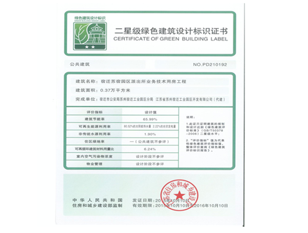 近日,由開發(fā)公司代建的蘇宿園區(qū)派出所業(yè)務(wù)技術(shù)用房工程,順利通過國家二星級綠色建筑設(shè)計(jì)標(biāo)識認(rèn)證。